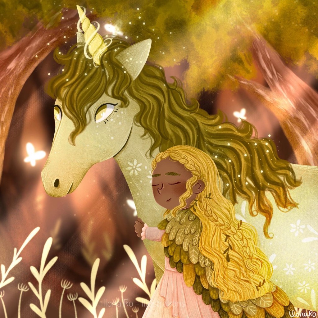 The whimsical feel is mostly given by the lighting, from both the horn of the unicorn and its hair, but also the butterflies around them.